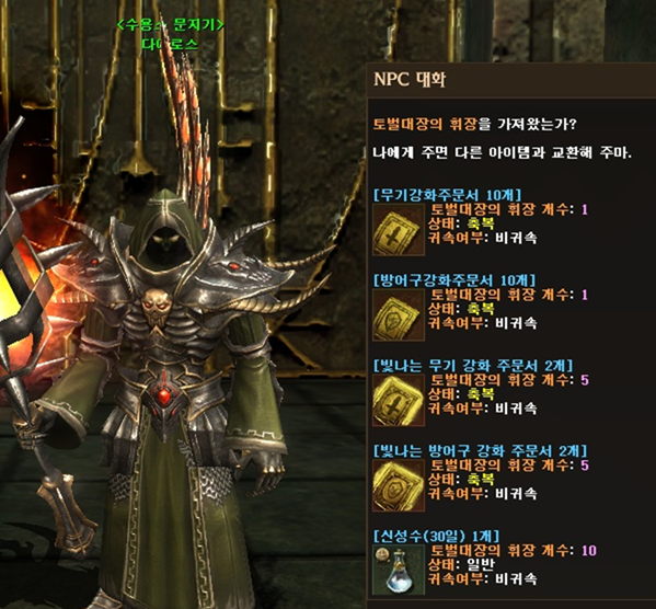 해당 휘장 아이템을 모아 <수용소 문지기> 다이로스를 통해 다양한 아이템을 교환할 수 있습니다.