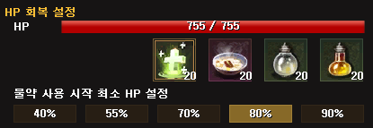 사냥 시 HP량에 따른 포션 사용, 귀환, 만복도, 버프 아이템 사용 등의 설정을 진행할 수 있습니다.