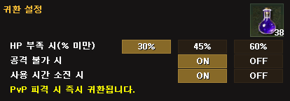 귀환 마법 포션을 등록하여 HP 상태, PvP, 공격 불가에 따른 귀환을 설정합니다.