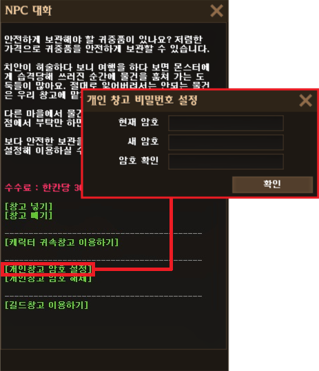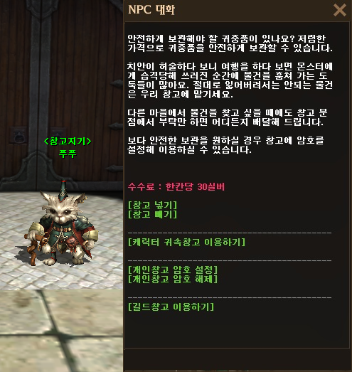 아이템 보관 시에는 아이템 한 칸당 개인창고는 30실버, 캐릭터 귀속창고는 100실버의 수수료를 소모합니다.