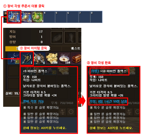 인벤토리에 장비 각성 주문서(무기/방어구)를 더블 클릭 후 각성할 장비를 클릭하면 각성됩니다.
