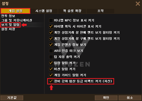 장비 강화 합산 등급 이펙트는 [설정] > [게임 설정] > [보기 및 알림]에서 ON/OFF 할 수 있습니다.