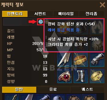 사냥 시 경험치 획득량 +10% 크리티컬 확률 증가 +2 |