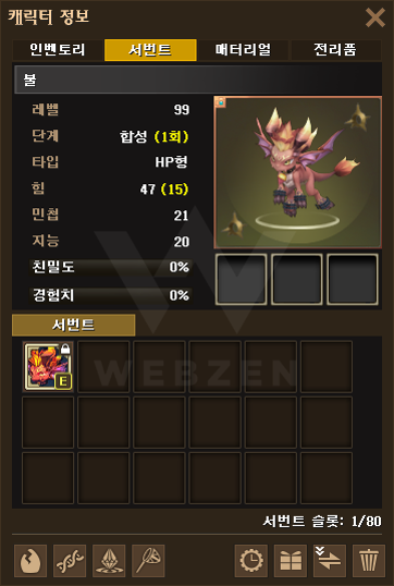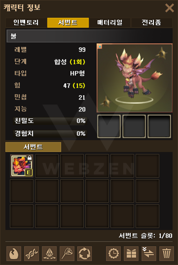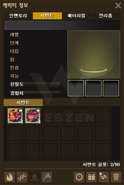 - 인벤토리 > 서번트 탭 하단의 2번째 버튼을 클릭하여 합성을 진행합니다.