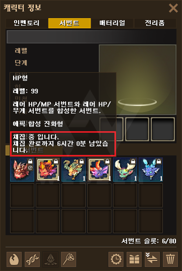 서번트 채집이 완료되며 채집 완료 버튼을 클릭하여 특별한 보상을 획득할 수 있으며