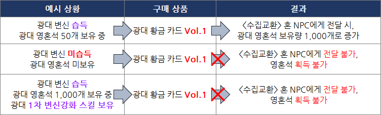➋ 세일즈 상품 구매로 획득한 “황금 카드 Vol.1”을 <수집교환> 혼 NPC에게 전달하면 변신 스킬 강화 생성에 필요한 영혼석을 모두 획득 가능!