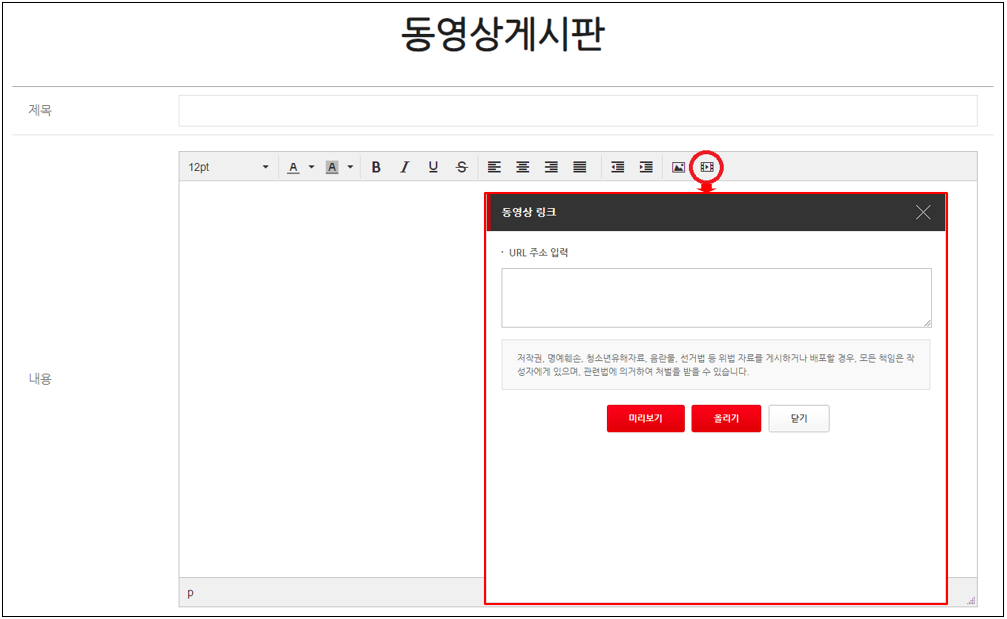 셋째, 비디오 삽입/수정 버튼을 클릭하여 유튜브에 등록한 영상 URL을 입력 후 올리기 버튼 클릭
